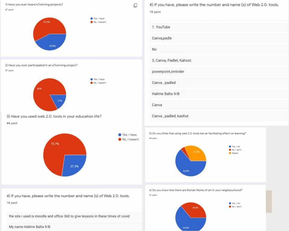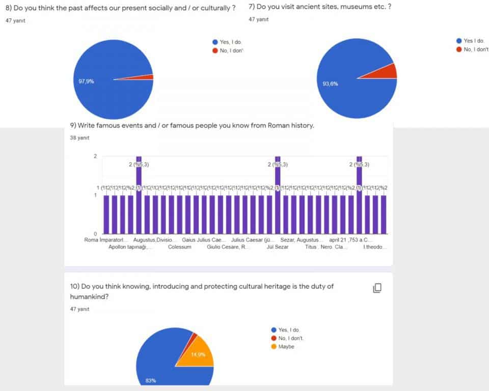 Roma İmparatorluğu ve Tarihiyle İlgili Sorulara İlişkin: Öğrencilerin% 63,8'i mahallesindeki Roma eserlerini biliyor. Öğrencilerin% 93,6'sı antik kentleri, müzeleri vb. Ziyaret ediyor. Neredeyse günümüz sosyal ve / veya kültürel olarak geçmişte kaldığını düşünüyor. Jules Caesar, Augustus, Titus, I. Theodosius, Nero çoğunlukla öğrenciler tarafından bilinir. Roma İmparatorluğu'nun Bölünmesi ve Sezar'ın Katledilmesi çoğunlukla öğrenciler tarafından bilinen konulardı. Son olarak, öğrencilerin% 83'ü kültürel mirası bilmenin, tanıtmanın ve korumanın insanlığın bir görevi olduğunu düşünüyor. Ön ankete katıldıkları için tüm öğrencilere teşekkür ederiz.